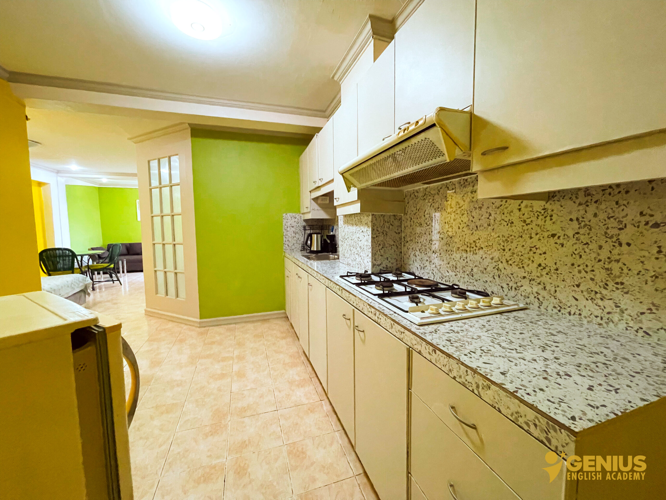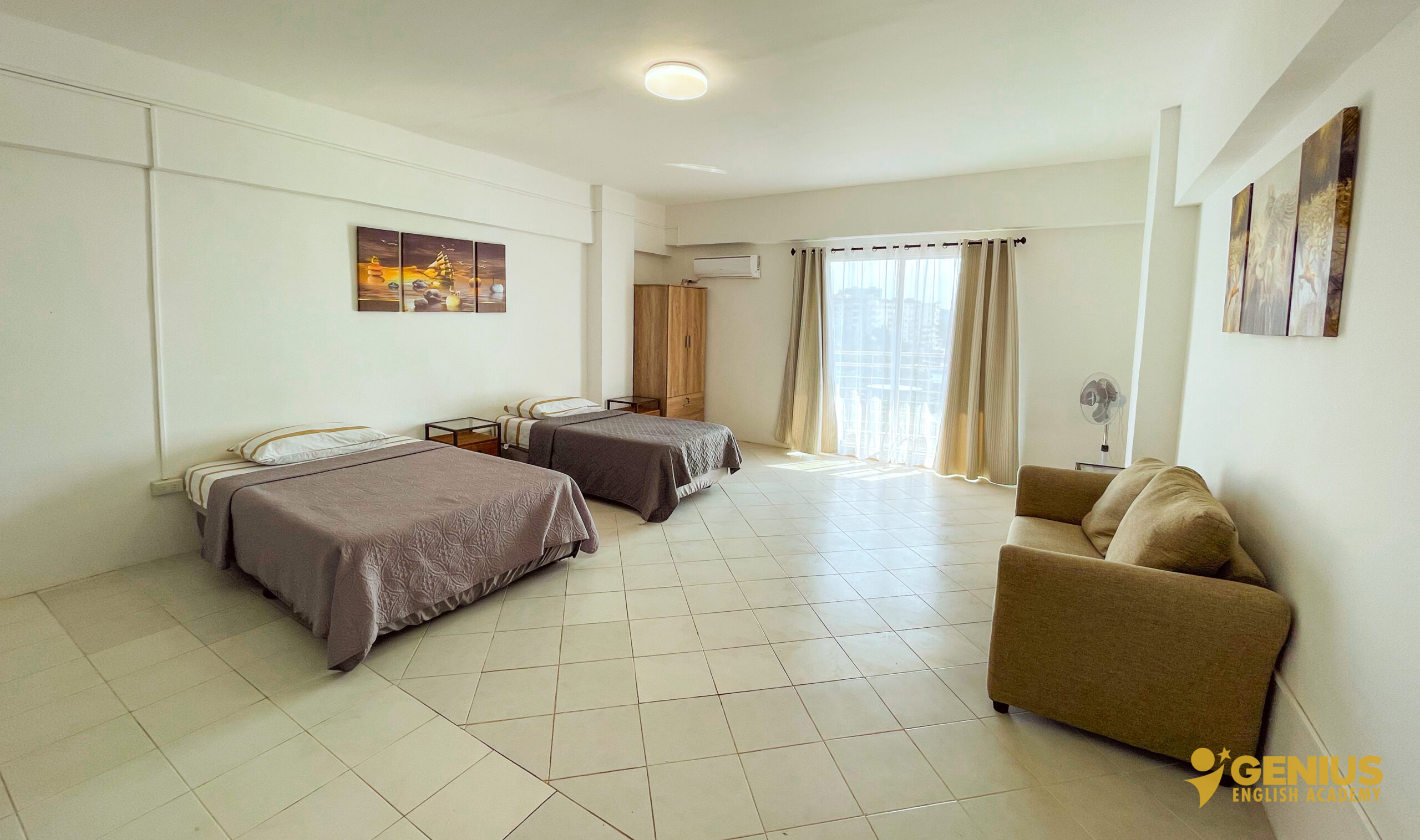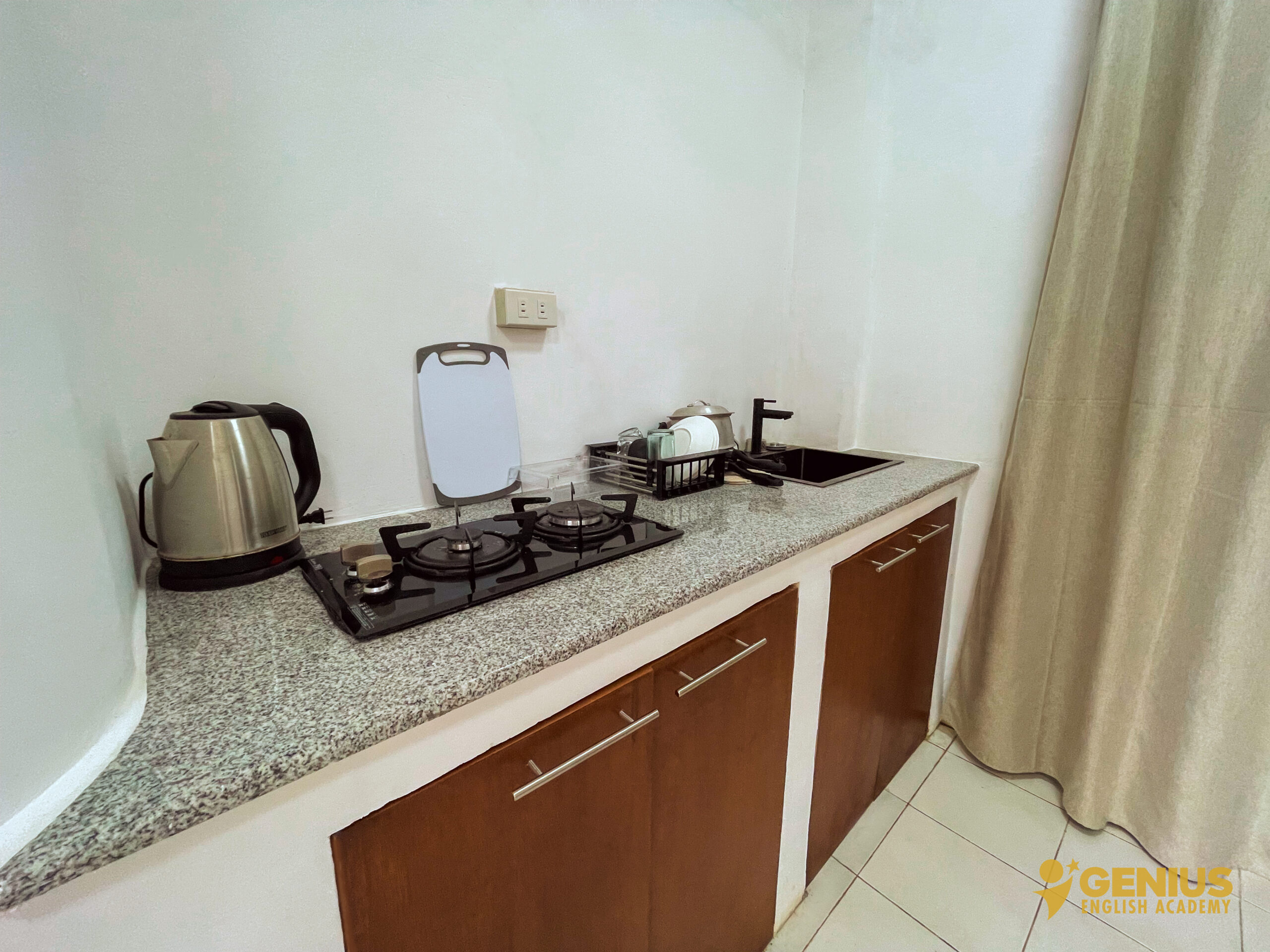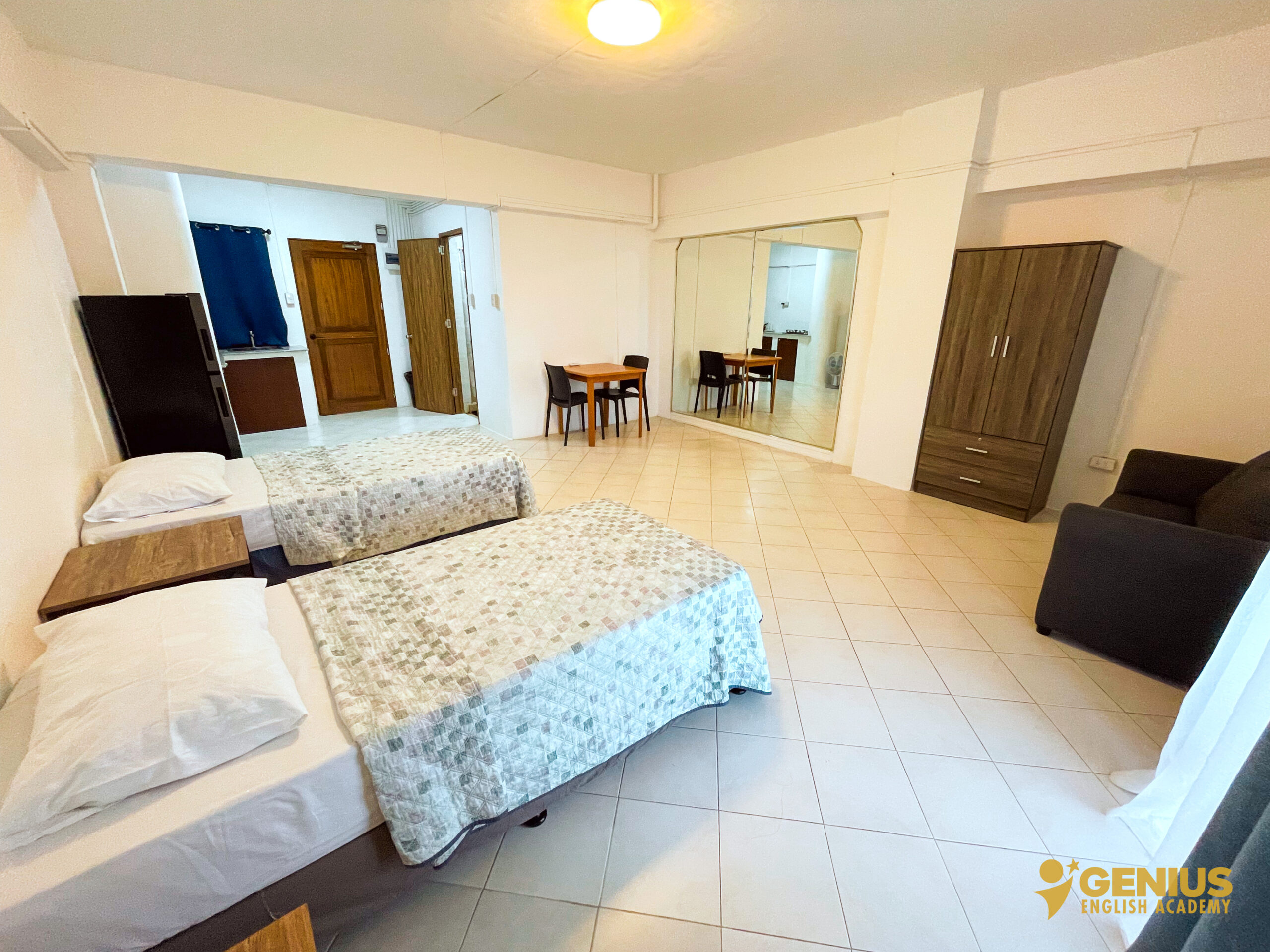 Our rooms at Genius English Academy are thoughtfully designed to provide both comfort and independence. Each room is equipped with a private kitchen, refrigerator, air conditioning, Wi-Fi, and a spacious balcony for relaxation. Enjoy the convenience of a hot and cold shower, with kettles and safety boxes available upon request. Unlimited access to clean drinking water ensures you stay refreshed throughout your stay. Combining the essentials of home with the freedom of campus life, our rooms are perfect for students and families seeking a cozy and convenient living space.